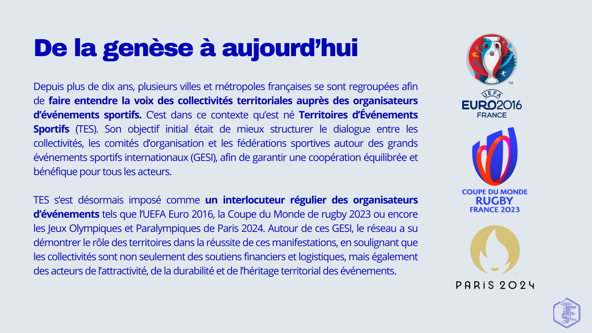 De l’UEFA Euro 2016 à la Coupe du Monde de Rugby 2023 et jusqu’aux Jeux Olympiques et Paralympiques de Paris 2024, TES s’est imposé comme un interlocuteur et un acteur clé du dialogue entre collectivités, comités d’organisation et fédérations.